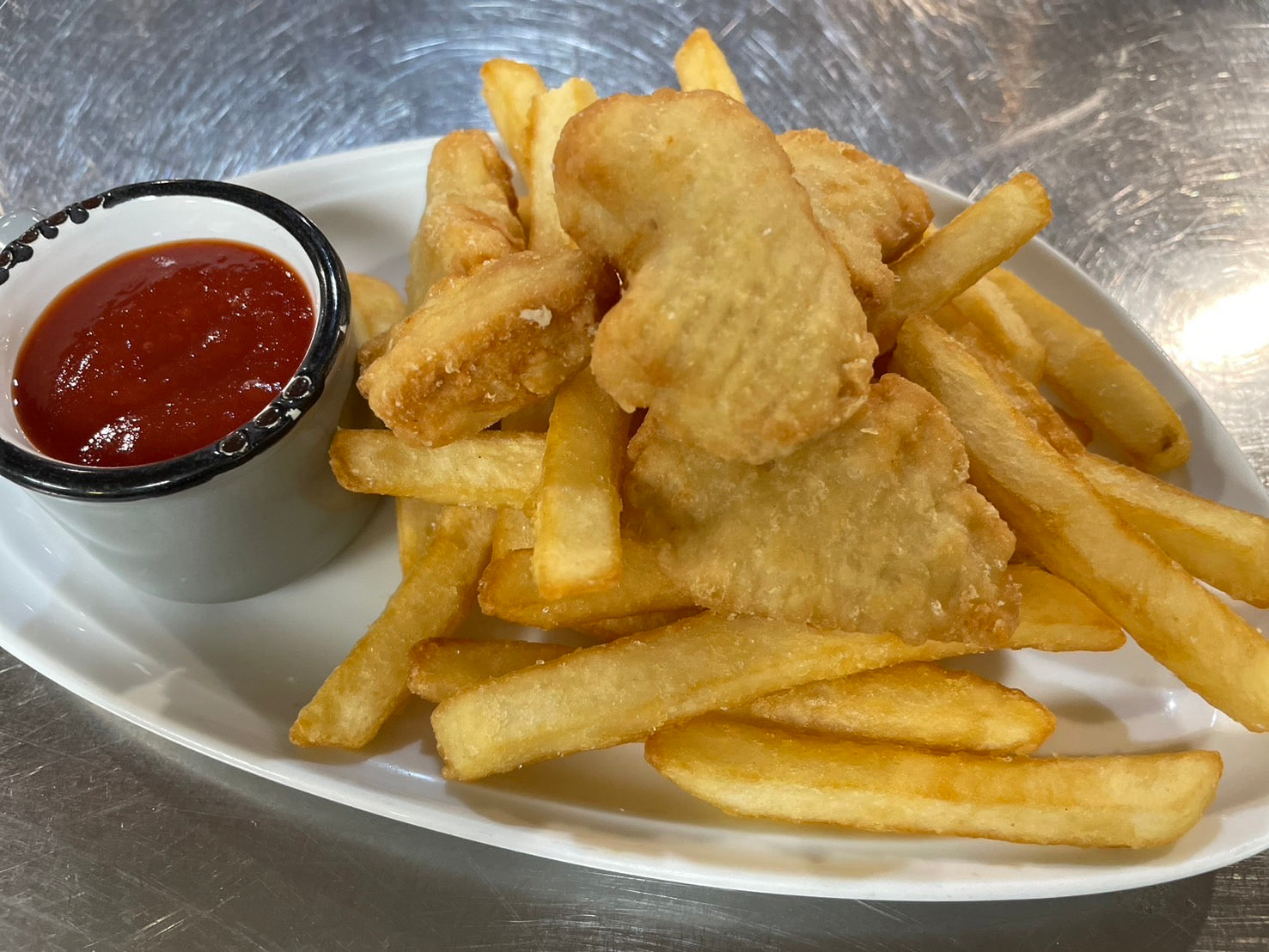 Kids Nuggets and chips served with tomato sauce
