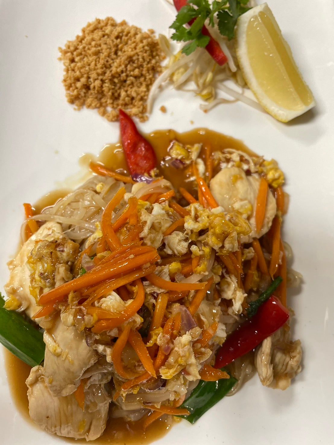 Tamarind Sauce, Egg, Spring Onion, Bean Sprout & Crushed Peanut with Your Choice of Meat.